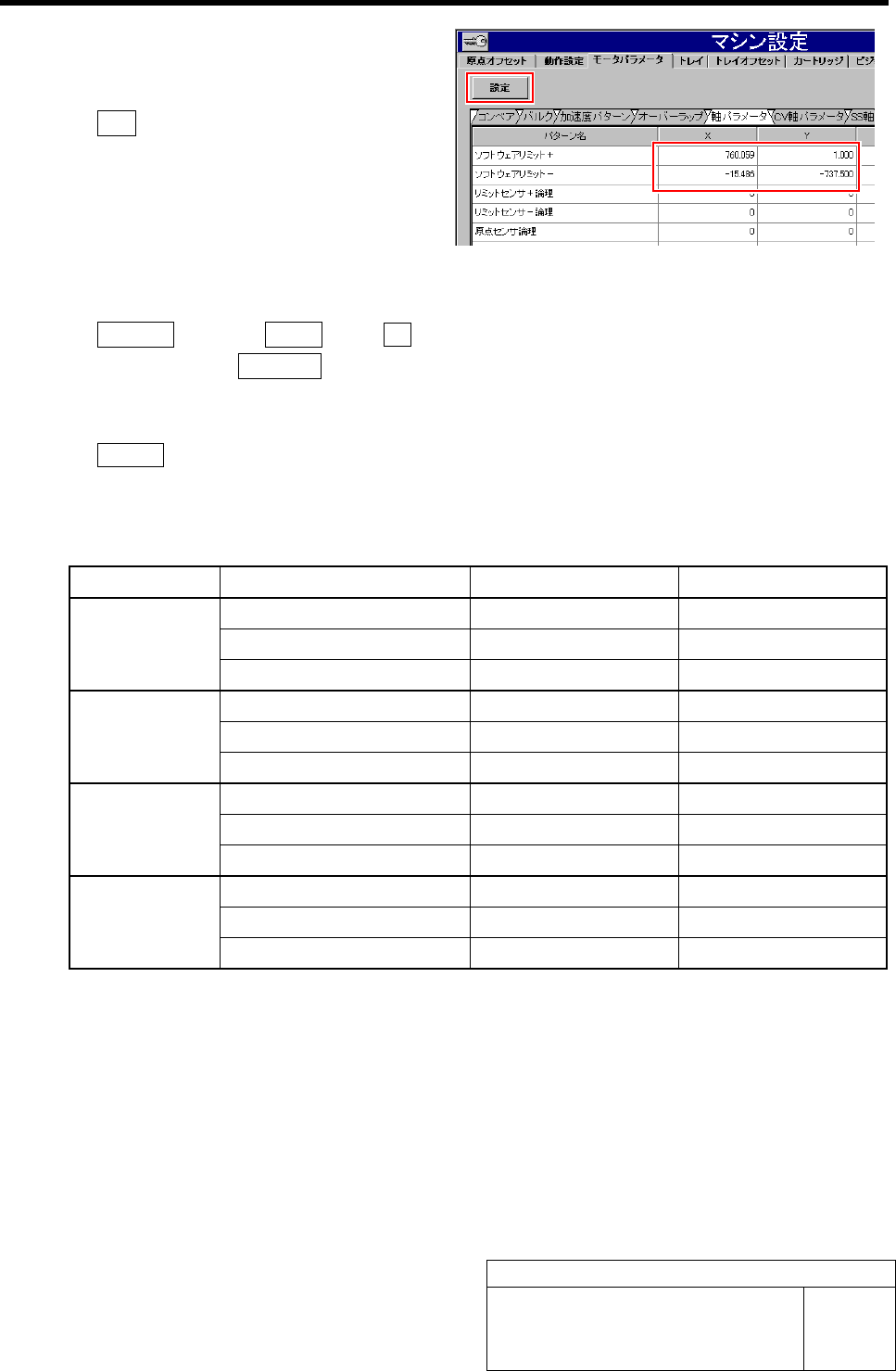 ソフトウェアリミットセットアップ HLF-20317-01 ソフトウェアリミットセットアップ SHEET 9/9 2. ソフトウェアリミット+、-行の XY 欄に 手順 7 で算出したソフ トウェアリミット座標を 入力します。 3. 設定 ボタンをクリックします。 設定したソフトウェアリミットの値が保存され ます。 9 ソフトウェアリミット動作時の座標を確認し ます。 1. 手動操作 メニュー Î 軸操作 タブ Î XY ボタンをクリッ…