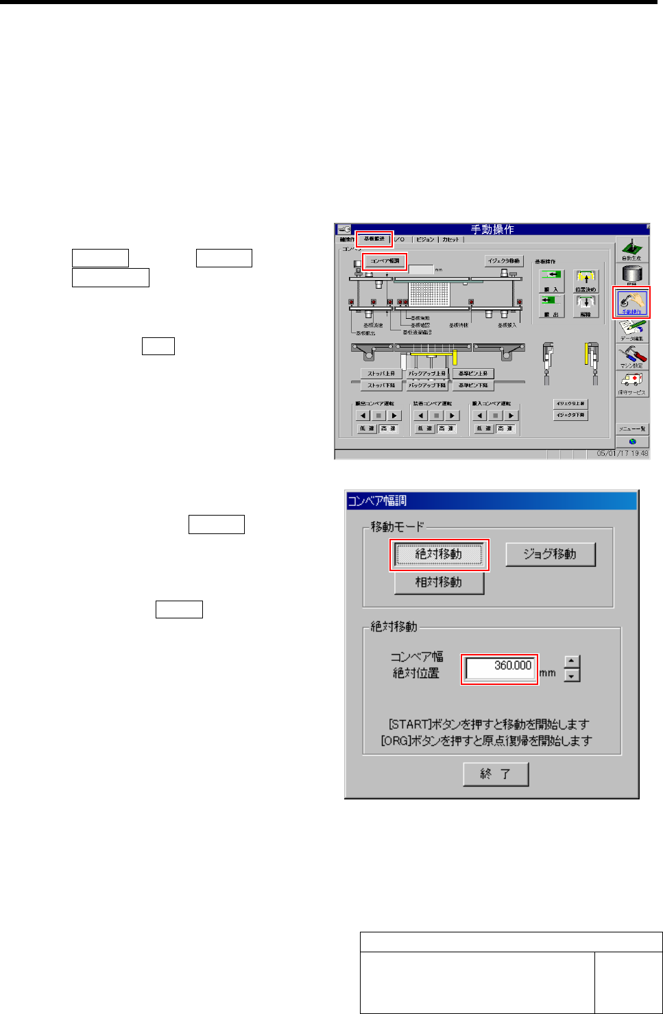 1. コンベア幅調画面の絶対移動 ボタンをクリ