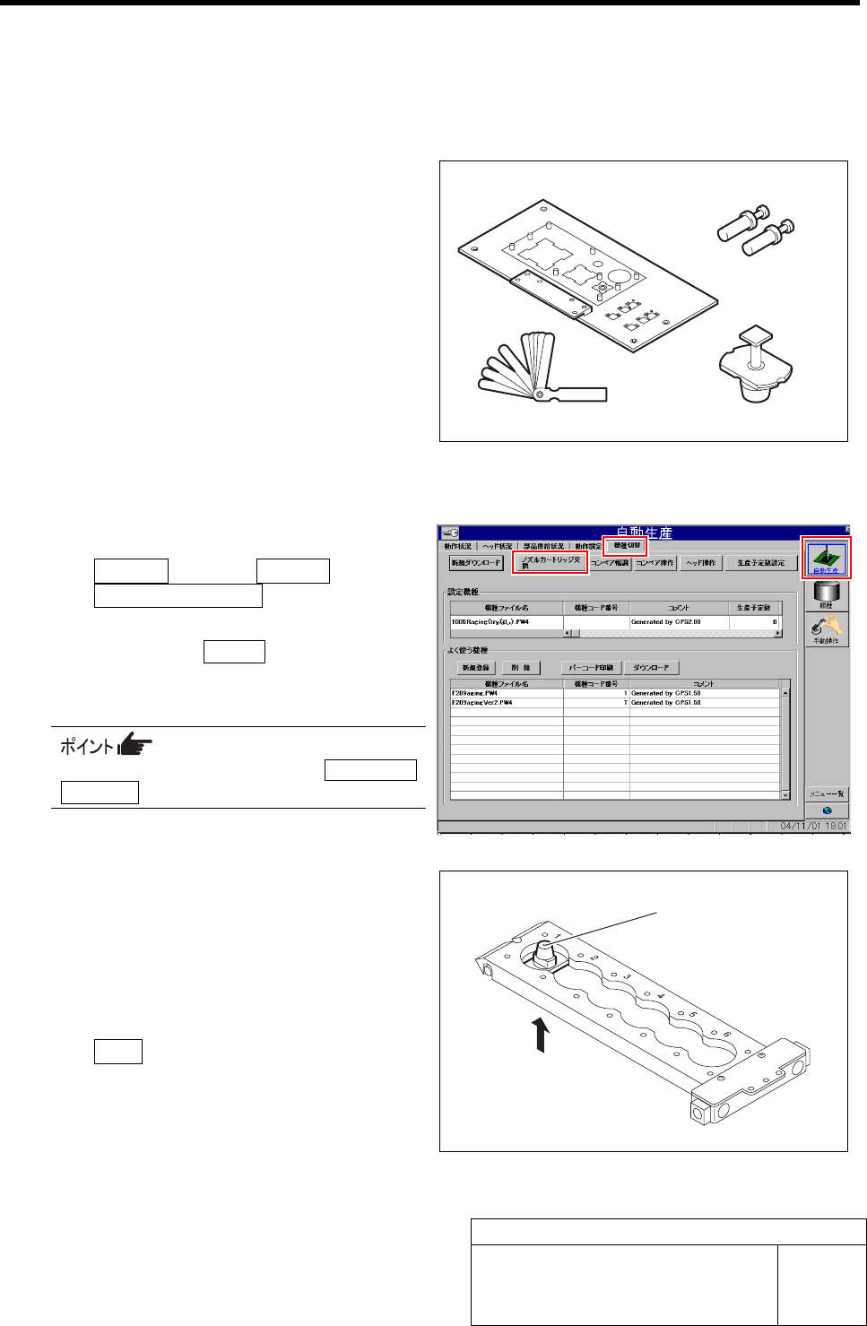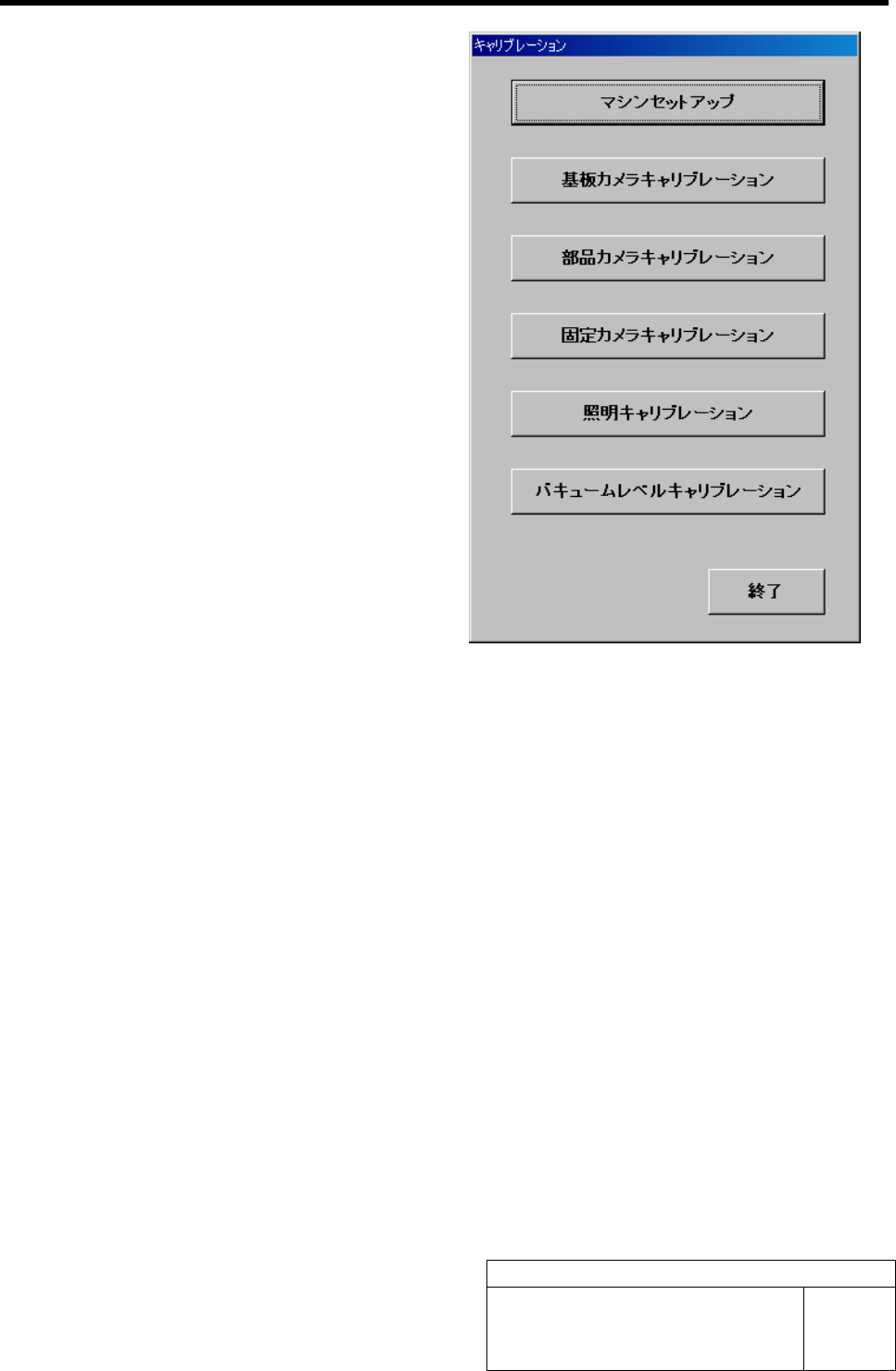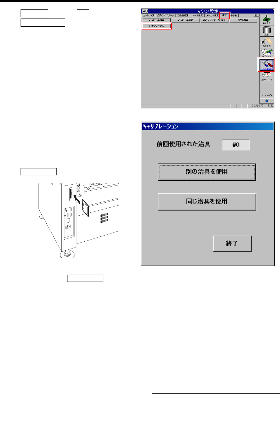 キャリブレーション画面の表示方法 HLF-20103-01 キャリブレーション画面の 表示方法 SHEET 3/3 冶具選択を行うとキャリブレーションメニュー画面が 表示されます。 次項以降で説明するマシンセットアップ、および各キ ャリブレーションは、このメ ニューからそれぞれの 操作 画面を開くことができます。
