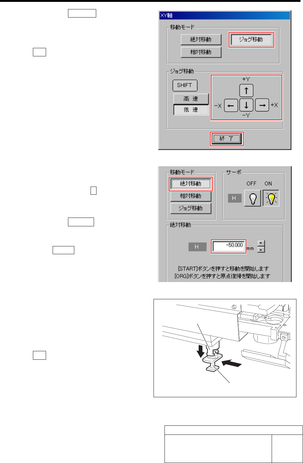 M 軸原点出し HLF-20203-01 M 軸原 点出し SHEET 3/4 2. 移動モードの ジョグ移動 ボタンをクリックし ます。 3. カーソルキーを押して、ヘッド部を手 前にジ ョグ移動させます。 4. 終了 ボタンをクリックして、 M 軸 原点出し 画面に戻ります。 3 H 軸を絶対移動で -50 mm の位置まで下げ ます。 1. M 軸 原点出し画面の H ボタンをクリックし ます。 H 軸の操作画面が表示されます。 …