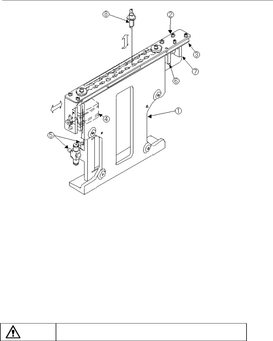 第 3 章 日常检查 Rev03 3.3.6 ATC ①ATC 底座 ⑤速度控制器 ②滑动板 ⑥ATC OPEN 传感器 ③ATC 底座板 ⑦ATC CLOSE 传感器 ④气缸 ⑧吸嘴 图 3.3.9 ATC ( FX1 ) 在「滑动板②」的上面若附着有芯片和脏物, 可能影响吸嘴的正常安装、拆卸,所以请使用含有 酒精的棉球进行清洁。 危险 为了防止意外启动造成 的事故,请在关掉电源后再进行清 洁工作。 3-15