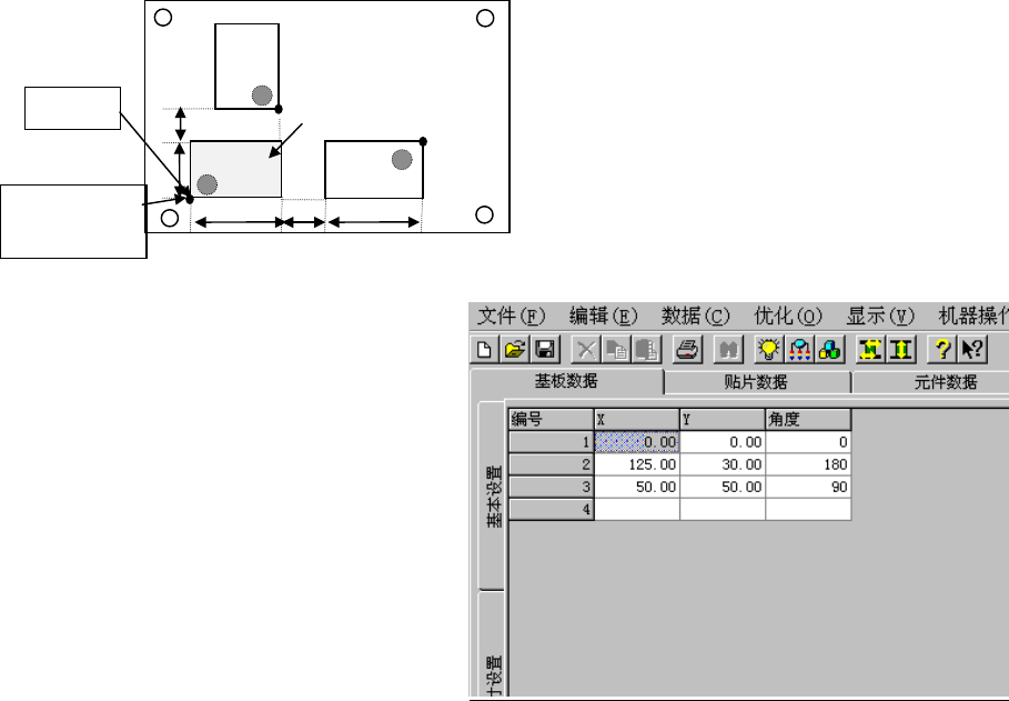 各电路的角度:以基板数据的“尺寸设置画面”设定的电路原点,及贴片数据所示的贴片坐