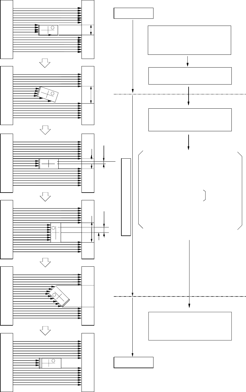 第 4 章 生产程序编辑 Rev03 ●激光定心的流程 A D d X B C d Y E A D d X B C d Y E 元件吸取 ① 驱动 Z 轴吸收元件, 将元件对 准激光照射线高度 预旋转 ( - ) 旋转 ( 预旋转 ) 接着,使θ按(-)方向旋转 (预旋转) ② 使θ轴向(+)方向旋转、 激光线开始测量定心 ( + ) 旋转 ( 吸 嘴 中 心 ) ③ 在测量中找出阴影宽度最小的③④。 (元件中心) 因吸嘴中心已知,故可…
