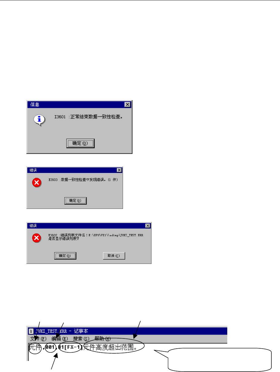第 4 章 生产程序编辑 Rev03 4-3-8 数据一致性检查 检查制作的程序与机器设置时的设定内容是否有矛盾,以及程序本身是否有矛盾。 一致性检查结束后, 才能进行优化。 如果检查的结果有错误, 则显示错误内容。 请参照显示 的内容,修改程序或「机器设置」。 1) 执行一致性检查 在菜单栏中,选择「数据」 / 「数据一致性检查」项,开始执行一致性检查。 2) 报告检查结果 一致性检查结束后,显示如下提示。 ①正常结束时 图 4. 3…