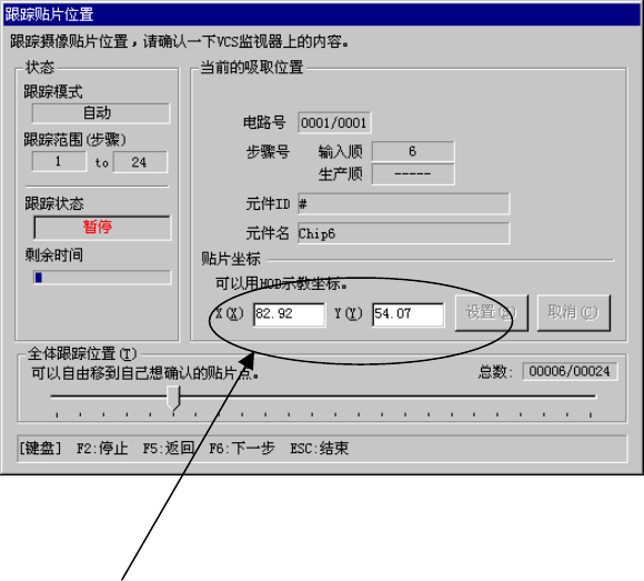 用摄像机跟踪贴片位置。确认显视器显示的贴片位置,若输入坐标不正确时,可用示教方法