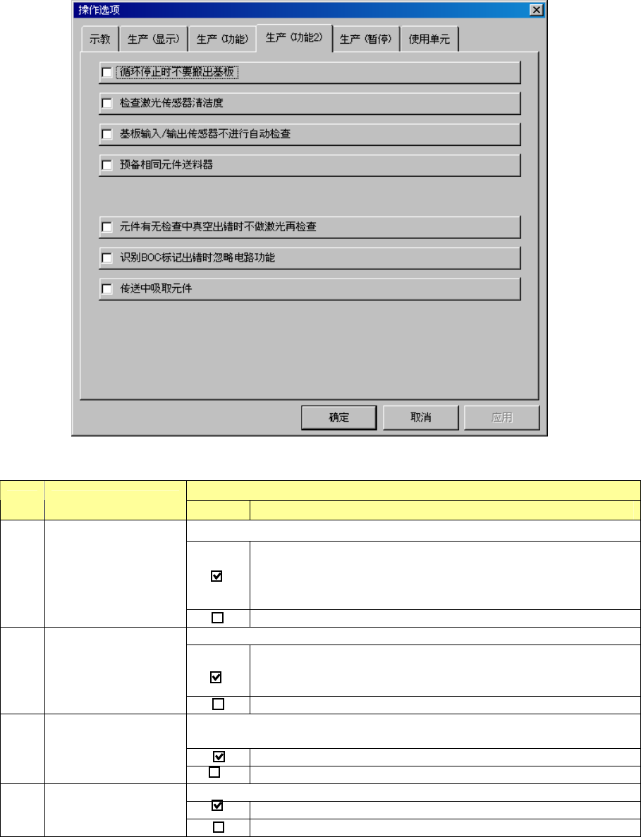第 5 章 其它功能 Rev03 设定:贴片前,是否用激光检查有无 元件。 用激光检查有无元件。 用激光检查时,激光高度需高于元件吸取后移动到贴片位置 时轴高度,因而减低元件贴片速度。 5 贴片之前用激光检查 元件的存在与否 不用激光检查有无元件。 设置在多电路生产中识别每条电路 的 BOC 标记发生错误时, 是否跳过该 电路的生产。 *使用坏板标记时只对识别出 坏板标记的电路跳过,此功能变 为无效。 另外, 在生产程序编辑的基板数据中…