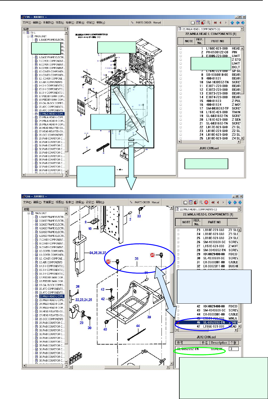 1)选择部品:从目录选择部品后,显示部品图和部品清单。