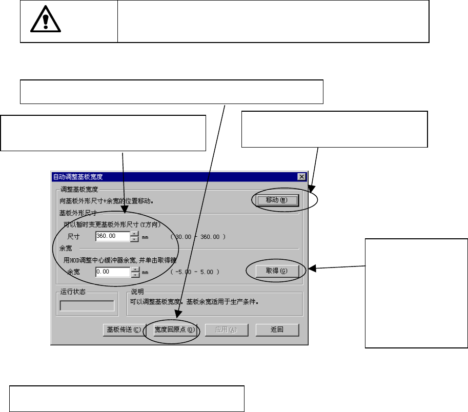 第2章 生产 Rev03 注意 按以下说明单击 “移动” 按钮后,传送功能 随之启动。 单击按钮 前,务必要确认传送运 行区没有障碍物。 ②输入[尺寸]、[余宽]。 (余宽宽度大约在+0.5mm 到 1mm。) ③单击 [移动],调整宽度。 马达开始旋转自行调整宽度。 “余宽”是指现 有传送宽度减去基 板外形长度之差 值。手动调整传送 宽度后,单击「取 得」。 ①点击[宽度回原点],使传送宽度返回原点。 图 2.7.1.3 自动宽度调整…