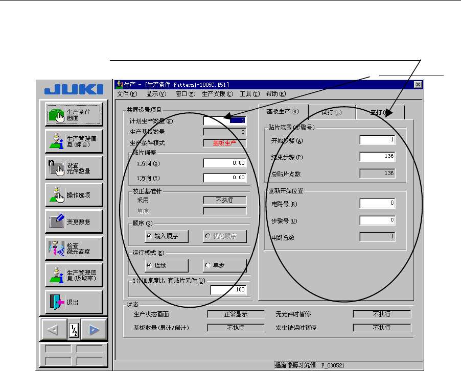 第2章 生产 Rev03 2-8-2 生产条件画面 启动生产画面后,出现生产条件设置画面。 “基板生产”、“试打”、“空打”每种生产模式,要分别设置生产条件。 ● 个别设置项目 : 选择“基板生产”、“试打”、“空打”模式后,设置所需条件。 ● 共同设置项目 :不论是“基板生产”,“试打”、“空打”,必须设置的 共同设置项目。 图 2.8.2.1 设置基板生产条件 2-8-2-1 共同设置项目 1)计划生产数量 输入计划生产数量。画面上…