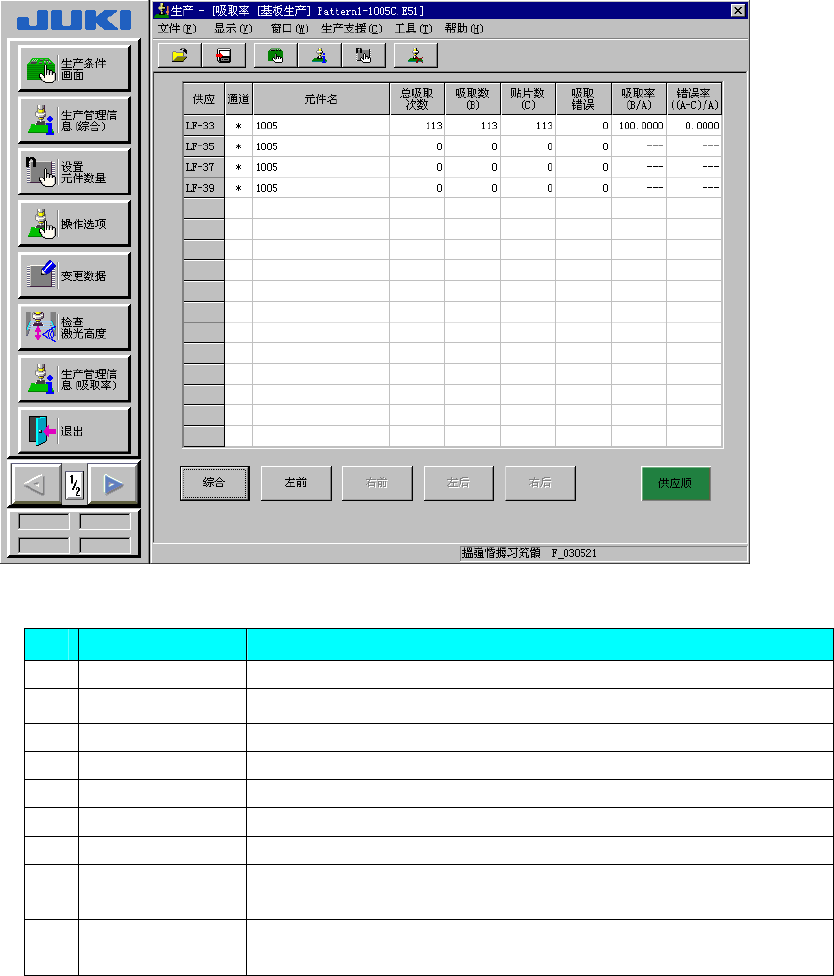 第2章 生产 Rev03 ③吸取率 显示“各供应设备的吸取率(吸取率 = 吸取数 / (吸取数 + 吸取错误数))”。 ◇ 画面通常从[吸取率最差]送料器开始排列。 (参见图 2.9.1.4) 图 2.9.1.4 吸取率显示画面(从最差者起排列示例) No. 项目 内容 1 供应 各供应位置。 2 通道 采用管状送料器时,为通道编号。 3 元件名 显示元件名。 4 总吸取次数(A) 吸取数 + 吸取错误数 5 吸取数(B) 吸取成功的元…