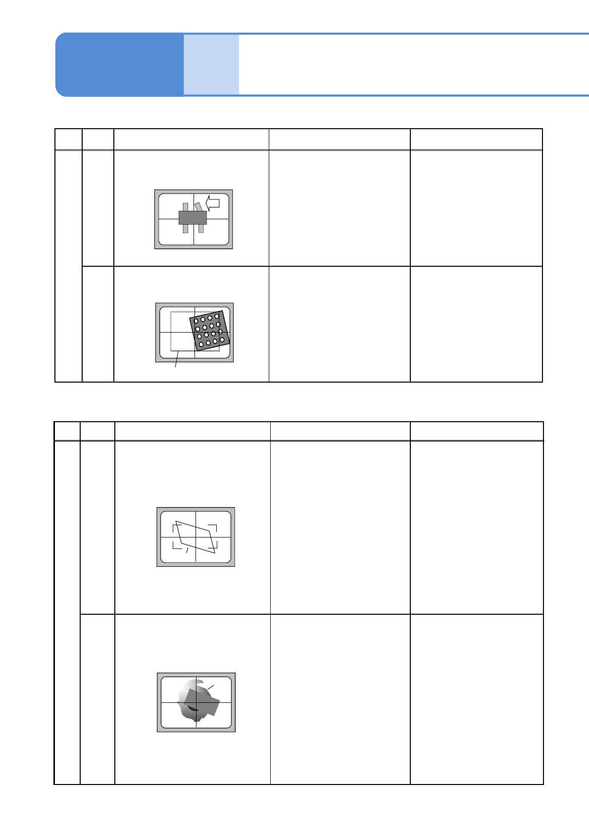 ■ 个别电极形状、电极状态异常 代码 内容 原因 对策 33 34 电极排列状态异常 电极长度异常 元件电极排列不在直线时会发生异 常 1) 元件有异常 ( 引脚浮起等 ) 请确认对象元件 < 图像状态参考 > 1) 元件有异常 ( 引脚浮起等 ) 2) 芯片数据设定有误 请确认对象元件 请确认电极位置的数据(电极位 置、尺寸、形状) 35 电极间距异常 < 图像状态参考 > 元件电极排列不均等时会发生异常 1)…