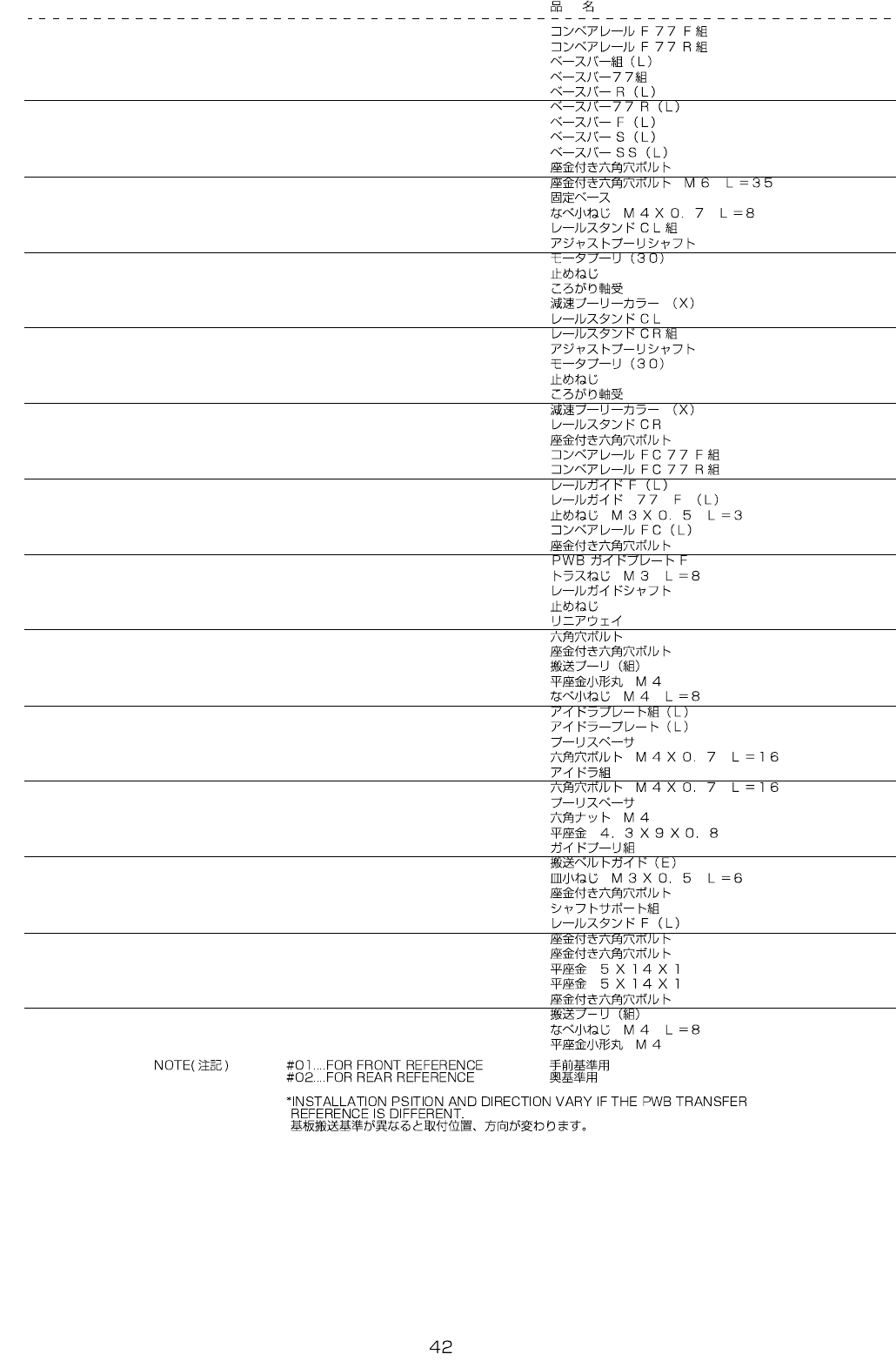 - - REF.NO NOT E P A RT NO D E S C R I P T I O N Q t y 1 #01 400-69747 C O N VE YOR RA IL F 7 7 F ASM 1 2 #02 400-69748 C O N VE YOR RA IL F 7 7 R A SM 1 3 #01 400-00994 BAS E BAR A SM(L) ( 1) 4 #02 400-69746 BAS E BAR…