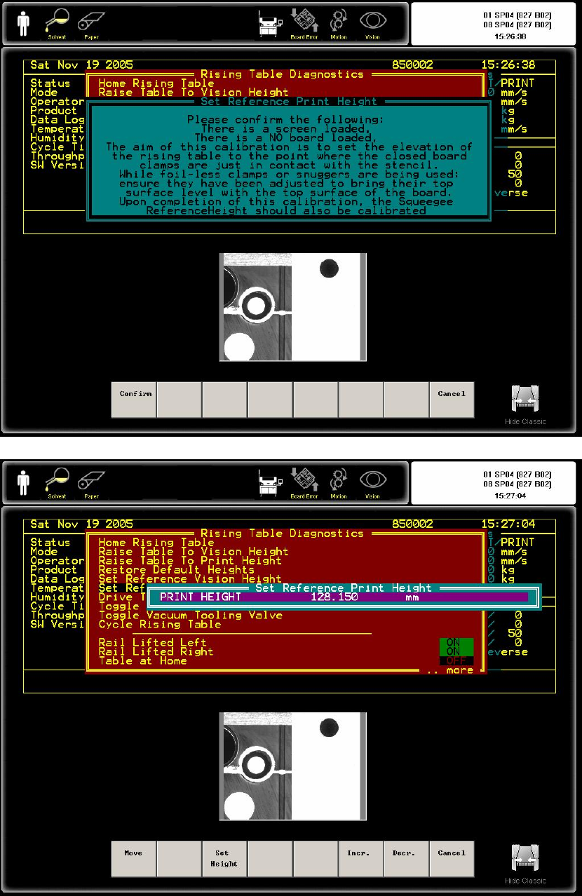 24. Squeegee print height calibration(In Diagnostic menu) • Select Calib Machine menu • Select Press ure • Select Continue • Select Step up /Step down to adjust the squeeg ee pressure • It w ill setup the Front & Rea…