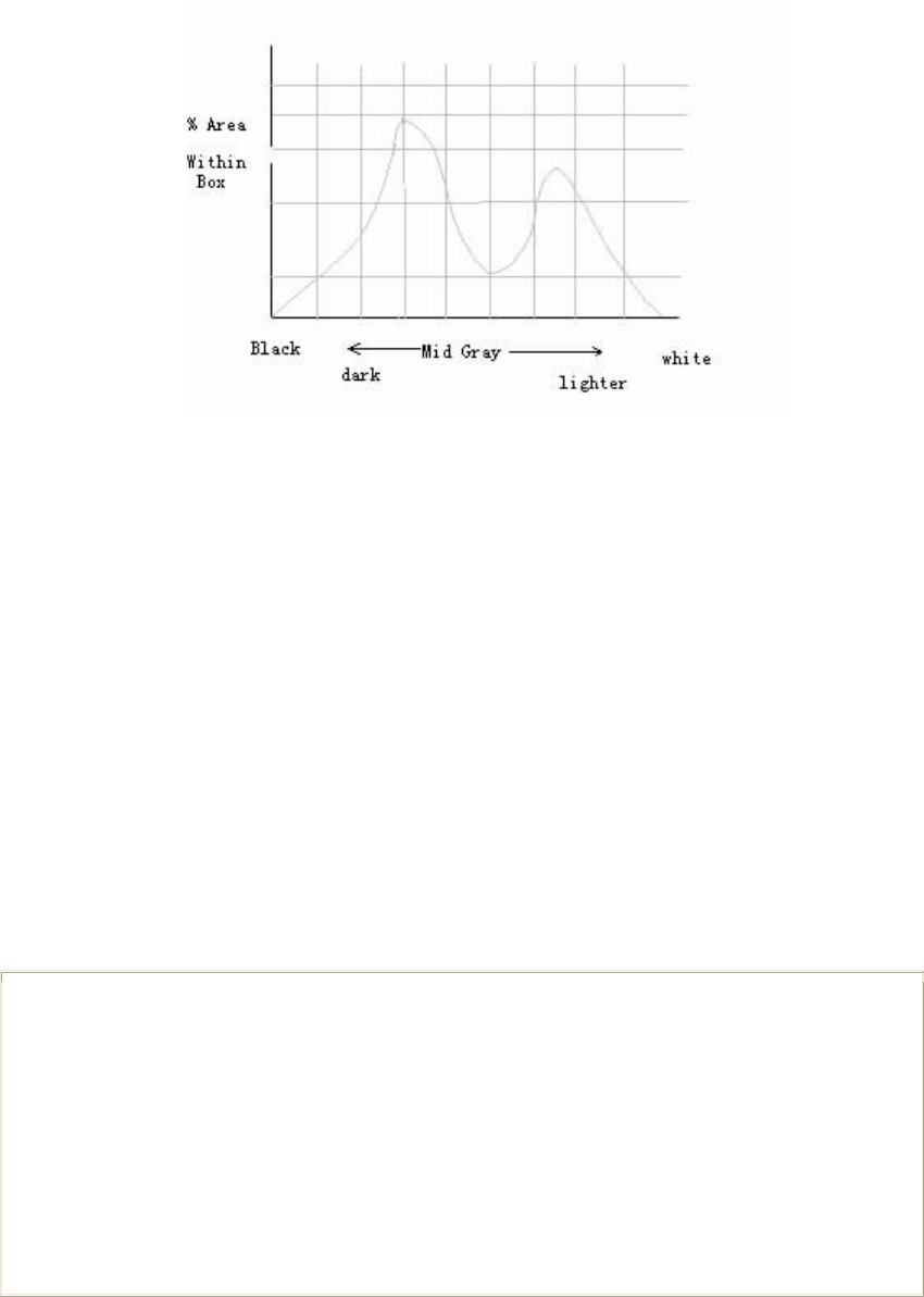 考虑的背景范围, 内圈和识别点之间是对识别点图象分析的范围, 对于以上分 析范围以外的部分如果出现干扰点, 机器就不会考虑。 但是如果如果内圈太大, 外圈太小,就比较容易出现印刷偏位。 2.2.3 光度的调节 调节原理 如上图,在柱状图中有两个尖峰值, 分别代表了 Dark 和 light 两种区域的图 形质 量,通过改变照射光的等级可以改变尖 峰之间的差值。调整结果是上图 的两个尖峰越高, 间距越大照相质量越好, 反之照相质量就差, …