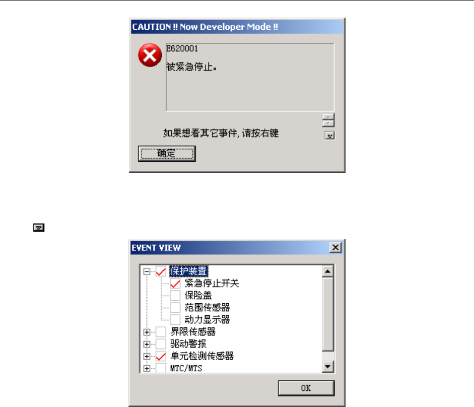 打开安全盖、按下紧急停止开关、或检测到各轴的伺服驱动的警报等时,显示类似如下画面。