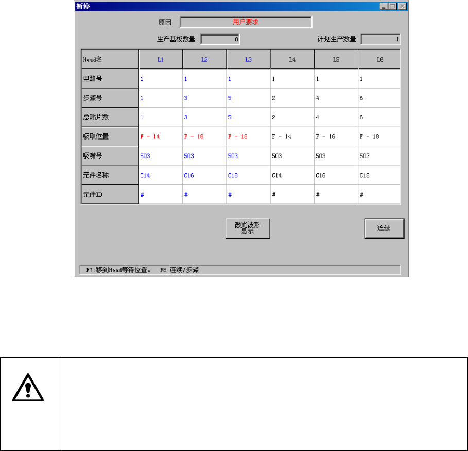 2) 在步骤生产中停止,或在连续生产中暂停时,按下键盘 “F7”键,可将贴片头移动