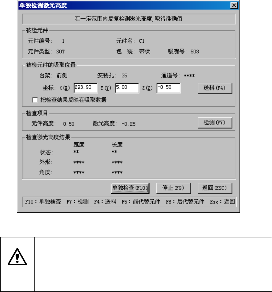 在连续检查中出现错误进入单独检查时,显示如下的激光高度单独检查画面。