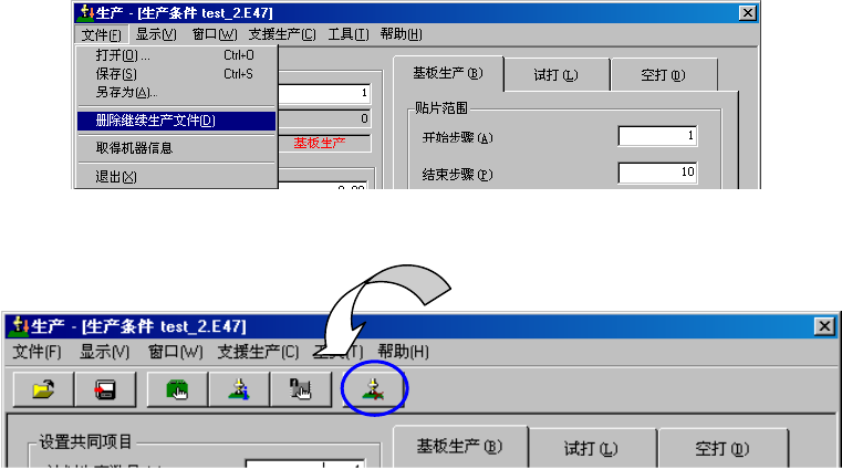 继续生产数据存在时,菜单栏中的“文件”/“删除继续生产文件”与工具栏的按钮显示为