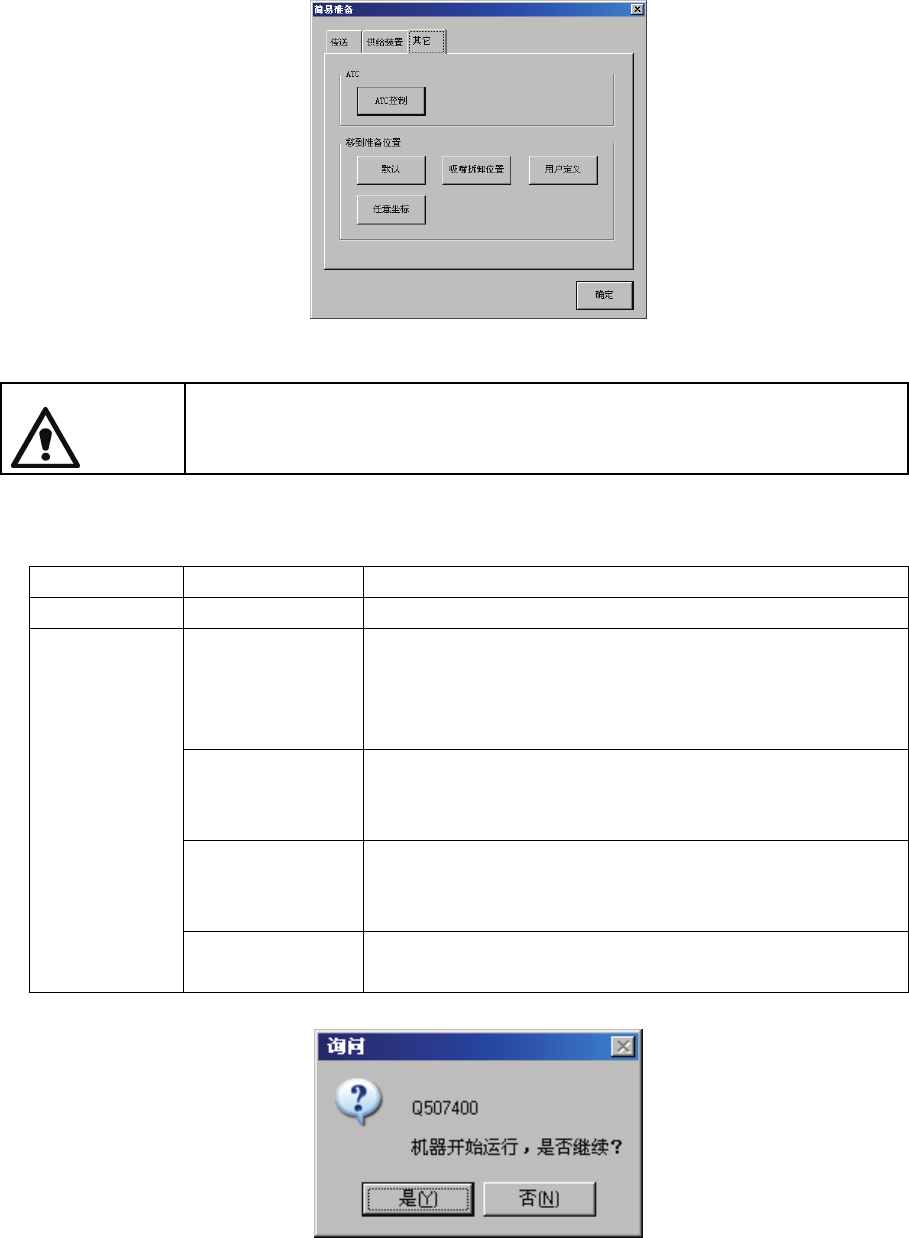 第 1 部 基本篇 第 2 章 生产 2-166 2-12-3-4 其他 图 2-12-3-4-1 简易准备对话框(其他) 单击以下的 “默认” 、 “吸嘴拆卸位置” 、 “用户定义” 或 “任意坐标” 按钮后, 轴会移动。 单击以前,请务必 确认设备内部没有人在 进行作业。另外,为 了 防止人身伤害,操作中切勿把手伸入设备内部,脸和头也不要靠近。 其他简易准备可进行以下的设置、控制。 关于[ATC]、[任意坐标]的详情,请参见《第 9…