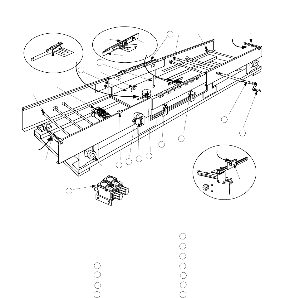 第 1 部 基本编 第 1 章 设备概要 1-8 1-2-1-1 基板传送部分的构造 ★ ★ ★ 图 1-2-1-4 基板传送 ① 搬入传感器 ⑧ 驱动轴 夹杆 Y(外形基准用) ② 搬出传感器 ⑨ 停止挡销 减压阀(外形基准用) ③ 停止传感器 ⑩ 夹杆 X(外形基准用) 等待传感器 ④ C-OUT 传感器 定心销 调节手柄 ⑤ 支撑台原点传感器 支撑台 调节停止挡销 ⑥ 传送电磁阀 马达 调整杆 ⑦ 传送马达 支撑销 手柄 ⑨ ② …