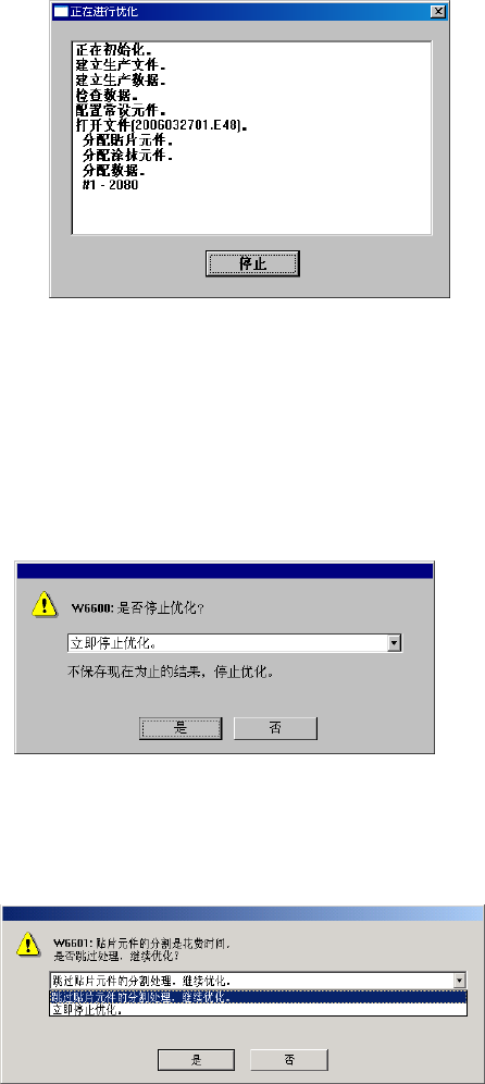 第1部 基本篇 第4章 制作生产程序 4-120 优化分配处理进入长时间处理的情况下 ,如下图所示,正在进行优化的画面中的按钮不显示 “停止”,而显示“跳过”。 优化正常结束时,“优化进行中”画面消失。 发生错误时,显示错误信息。 在进行优化的过程中,可通过单击“停止”按钮来中断优化。 单击“停止”按钮,显示如下的确认信息。 单击“跳过”按钮时,显示如下确认提示信息。 单击“是”后,停止优化。 跳过贴片元件的分割处理,继续优化: 仅跳过…