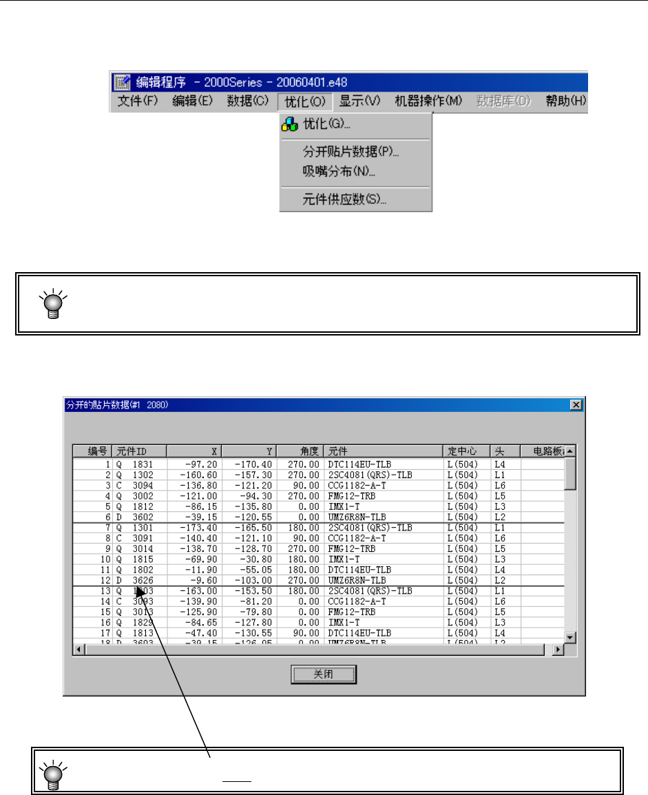 第1部 基本篇 第4章 制作生产程序 4-122 4-4-2-3 确认分开贴片数据 通过优化,显示已分配的贴片数据。 请从菜单中选择“优化”/“分开贴片数据”。 图 4.4.2.3-1 选择分开贴片数据菜单 ● 本菜单在未进行优化时(分 配文件不存在),或在优化后变更了过生产程序时,不能 选择。 显示如下的分开贴片数据画面。 图 4.4.2.3-2 分开贴片数据显示例 *优化顺序显示时的粗线 ,表示在 1 次吸 取贴片的周期动作中被配对…