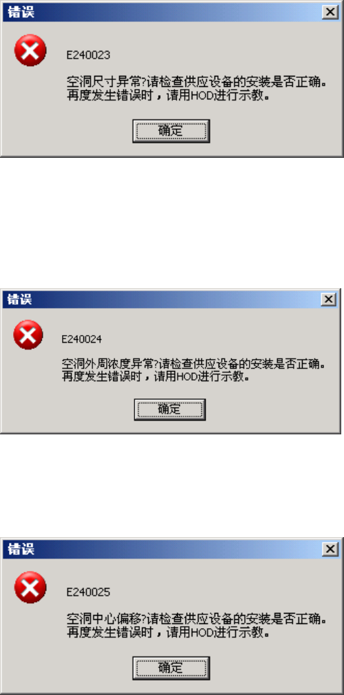 第1部 基本篇 第4章 制作生产程序 4-223 10) 跟踪时的自动示教 跟踪暂停时,可进行自动示教。 自动示教时,会出现下列 5 种错误/询问。 ①尺寸异常时 空洞指的是, 安装元件的凹进部分。 空 洞尺寸与元件尺寸相比显得异常时, 会显示如下 错 误提示。 ②浓度异常时 空洞影子浓度异常时,会显示如下错误提示。 ③ 空洞中心偏移时 设定的吸取数据与自动示教矫正的吸取数据差距过大时,显示如下错误提示。