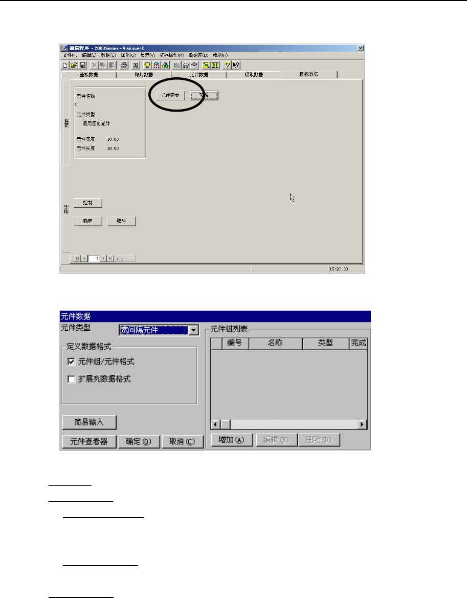 第2部 功能详解篇 第6章 通用图像 6-4 6-2 通用图像的输入项目 在“元件数据”里设置 元件的通用图像后,“通用数 据”的表格上将会显示 “元素要素” 按钮”。 图 6-2-1 通用图像元件的 表格 画面 点击“元件要素”按钮后,将显示如下通用图像元件数据的制作画面。 图 6-2-2 制作通用图像元件数据的初始画面 ●元件类型 :选择 QFP 等引脚元件或 BGA 等的球元件或外形识别元件。 ●定义数据格式 ◇元件组/元件格式 …