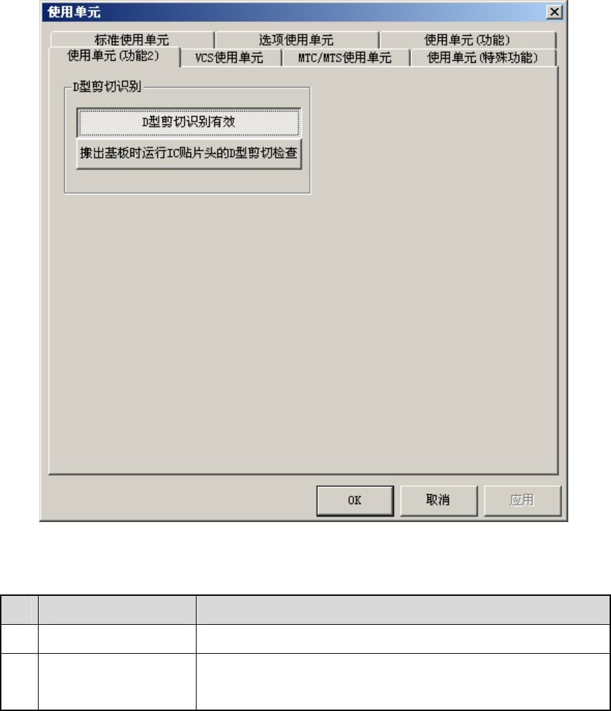 第2部 基本编 第8章 机器设置 8-25 8-5-10-3 使用单元(功能 2) 选择“使用单元(功能 2)”标签后,会显示如下“使用单元(功能 2)”的设置画面。 (只可在 KE-2080 上设置。KE-2070 上没有“使用单元(功能 2)”标签。) 图 8-5-10-3 使用单元(功能 2)的设置画面 表 8-5-3 使用单元(功能 2)有效时的动作 No. 单元 生产动作 1 D 型剪切识别有效 生产时VCS执行D型剪切识别动…