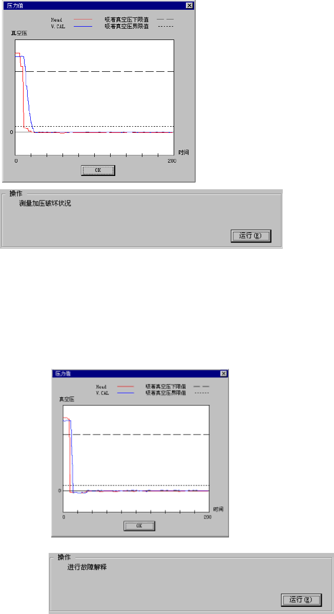 第2部 功能详细篇 第1 1章 自动校准 11-15 ② 设定Head将移动到真空校准上,测量3次自然破坏状况。 ·显示第2次与第3次的平均值。 · 测量后所显示的压力值图表为第3次的数据。 请选择“运行”。 选择“运行”,则自动测量加压破坏状况。 ③ 设定Head将移动到真空校准上,测量3次加压破坏状况。 ·显示第2次与第3次的平均值。 · 测量后所显示的压力值图表为第3次的数据。 请选择“运行”。 选择“运行”,进行…
