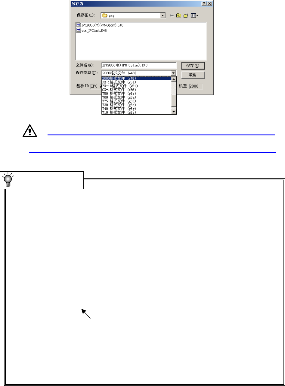 第 1 部 基本编 第 1 章 设备概要 1- 74 若要用其他机种的文件类型保存生产程序时,请选择“文件类型”后,再点击“保存”。 图 1-5-4-3 用其他机种的文件类型保存 文件名的设置根据 Windows 的规定和限制进行,也可用日语设置长文件名。 ● 程序名称 程序名称为保存在记忆装置中的文件名。因此,程序名称可采用Windows允许使用的文件名。 但扩展名会因机种不同而被自动添加。另外,不能更改扩展名。 ※ UNTITLED…