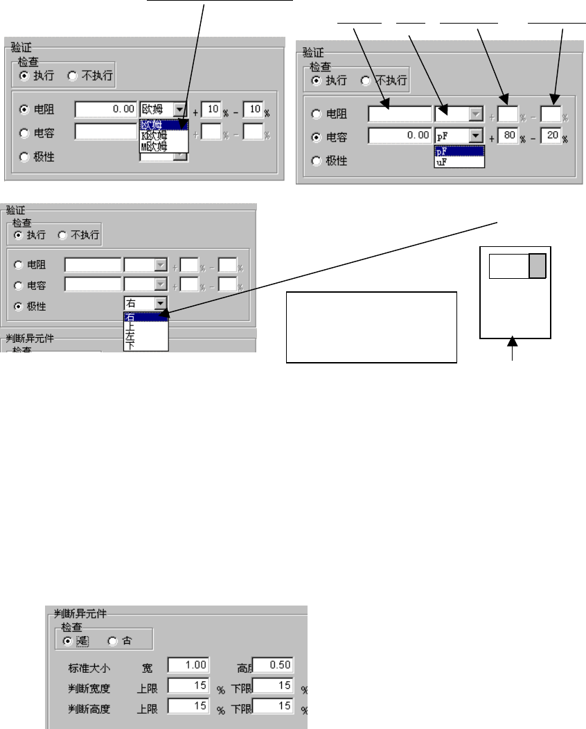 指定是否检查电阻值、电容器容量与极性,及其判定值。可对生产前与元件用完后的最初元