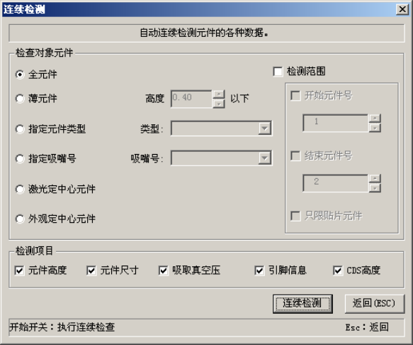 第1部 基本篇 第4章 制作生产程序 4-180 3) 连续测量 测量所有指定的元件。 ① 设置连续测量条件 从菜单栏中选择“机器操作”/“测量”/“连续检测”,显示如下画面。 图 4.5.4.2.3-9 设置连续测量条件 (1) 测量对象元件 设置对元件数据中有某一条件一致的元件进行测量。 ● 全元件 测量所有的元件数据。 ● 薄元件 仅测量元件高度在设定尺寸以下的元件。 ● 指定元件类型 仅测量指定的元件类别。 ● 指定吸嘴号 仅测…