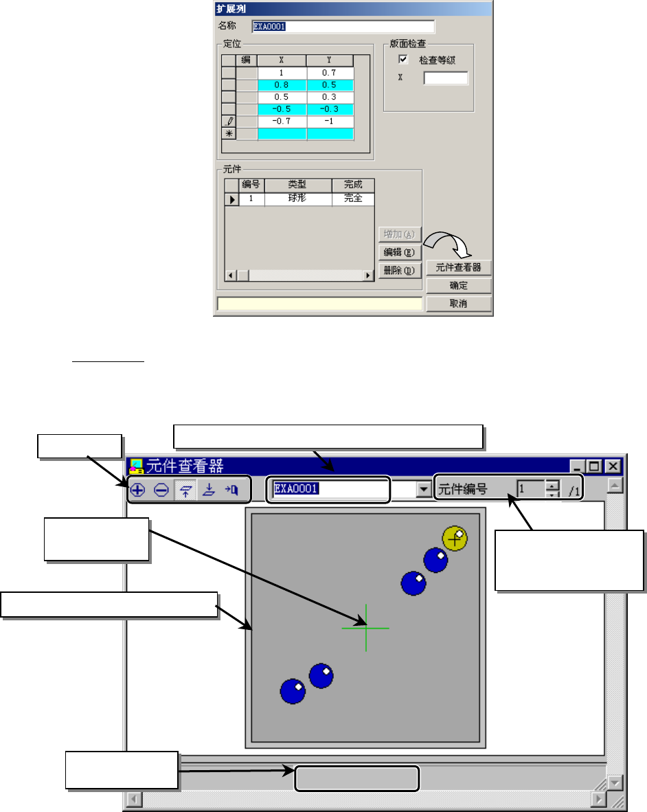 第2部 功能详解篇 第6章 通用图像 6-18 从扩展列画面中调出 单击扩展列画面的“元件查看器”按钮。 画面显示例 显示扩展列数据的配置图形。 用旋转控制器移动元件编号, 单击画面上的要素, 所选择 的要素以黄色显示。(未选择的要素以兰色显示。) 在元件数据中输入的元件外形 元件中心用十字 线表示 选择的要素坐标 工具栏 扩展列数据组列表(仅显示) 选择要素的元件编号和 总数 (1.0000, 0.7000)