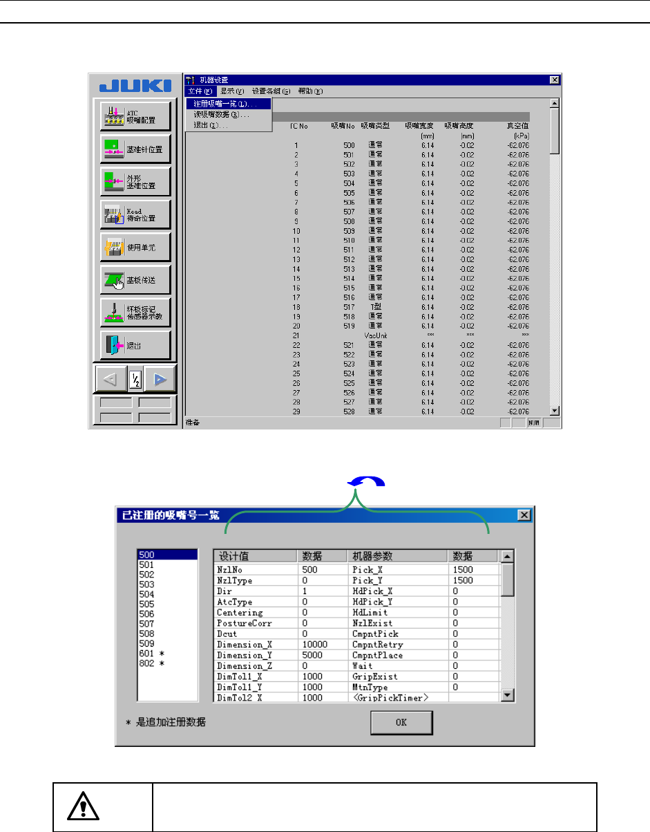 (500~509)。右侧的列表框中显示左侧列表框中已选中的吸嘴数据。