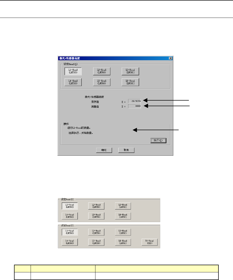 第2部 功能详细篇 第1 1章 自动校准 11-4 11-2 设置组 11-2-1 激光传感器高度 设置从基板上方看到的各激光传感器高度。 当频繁发生激光识别错误时,请检查 生产程序的“元件数据”,然后重新设置机器设置 的“ATC 吸嘴配置 ”。即使这样也不能改善时,请重新设置“激光传感器高度”。 重新设置“激光传感器高度”后,务必重新设置“ATC吸嘴配置”。 图 11-2-1-1 激光传感器高度 设定Head 用复选框按钮选择设定…