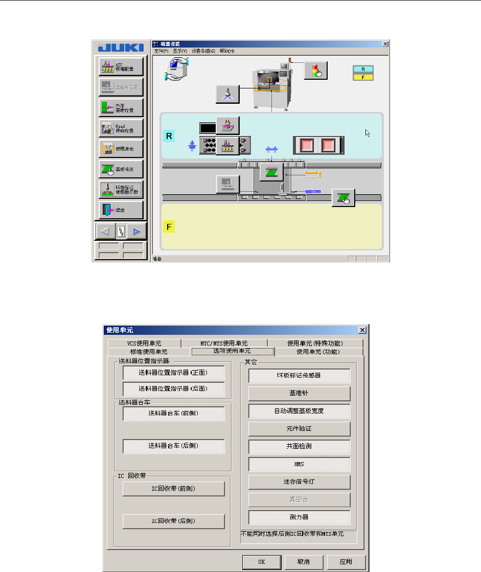 第2部 功能详细篇 第1 2章 选项元件 12-28 12-9-4 机器设置 进行共面检查时,必须进行“机器设置”。 启动“机器设置”。 图 12-9-4-1 机器设置画面 1) 在菜单栏中,选择“使用单元”/“选项使用单元” 。 图 12-9-4-2 选项使用单元 请用按钮指定“共面检测”。 设置为:在按钮为凸状态时不使用,凹状态时为使用。