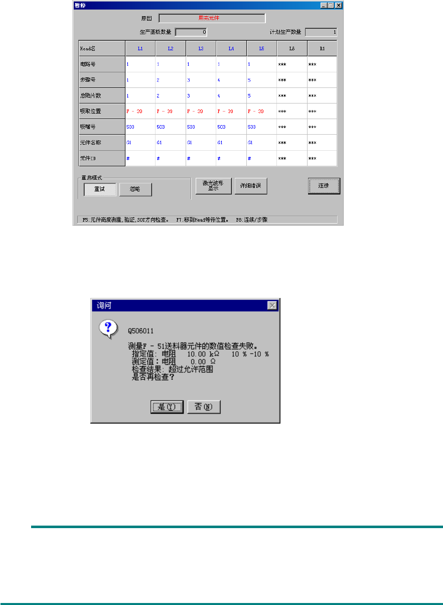 选择<否>时,则对下一次发生无元件的供料器的元件进行验证检查,或转为生产再开始。