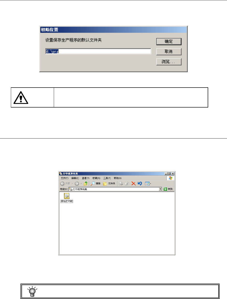 第 1 部 基本编 第 1 章 设备概要 1- 76 1-5-6 生产程序初始目录 建立生产程序初始目录(文件夹),以便读入或输入生产程序。 在菜单栏中选择“文件”/“生产程序初始设置”后,会显示如下画面。 单击“浏览”按钮,从文件夹一览中选择初始目录。选择后单击「确定」。 图 1-5-6-1 生产程序初始设置对话框 注意 请不要在C盘设置文件夹。在C盘设置时会显示错误。 1-5-7 打印机设置 添加、设置打印机。 1. 在菜单栏中单击…