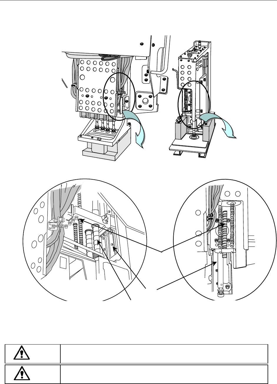 第3章 保养 Rev00 3-4-6 支撑台 请在*标记的滚珠丝杠轴3处全部涂抹润滑油。 用手将支撑台拉起后,在两侧涂抹油脂。 * * 图 3- 35支撑台 注意 请勿使用润滑脂(C 润滑脂)以外的润滑脂。 如果与其它的润滑脂混使用,可能会使润滑脂脱离涂抹部位后滴落。 危险 为防止因意外启动而引发事故,请在切断电源后进行涂抹作业。 3-4-7 统一交换台(选购件) 请在“台架定位销①”和“导引轴②”处涂抹润滑油。 1 1 2 2 图 3…