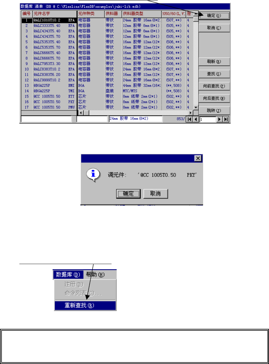 第 5 章 其它功能 Rev01 ③ 显示数据库一览表。选择元件名,单击“确定” 。 图 5- 1 数据库一览表 ④ 显示如下画面。单击“确定”后,即被注册。 3) 已在贴片数据中输入元件名时(CAD 转换的数据等) 如果数据库中已经注册了“贴片数据”的元件名,将数据库的元件数据统一注册到程序。(统 一再调用 ※ 功能) 单击”数据库”/“重新查找”。 ※ 统一再调用: 用数据库和贴片数据核对元件名, 如果有相同的元件名, 则从数据库中…