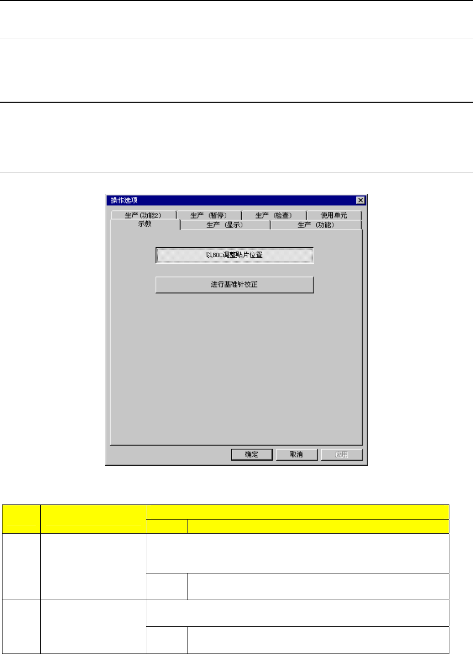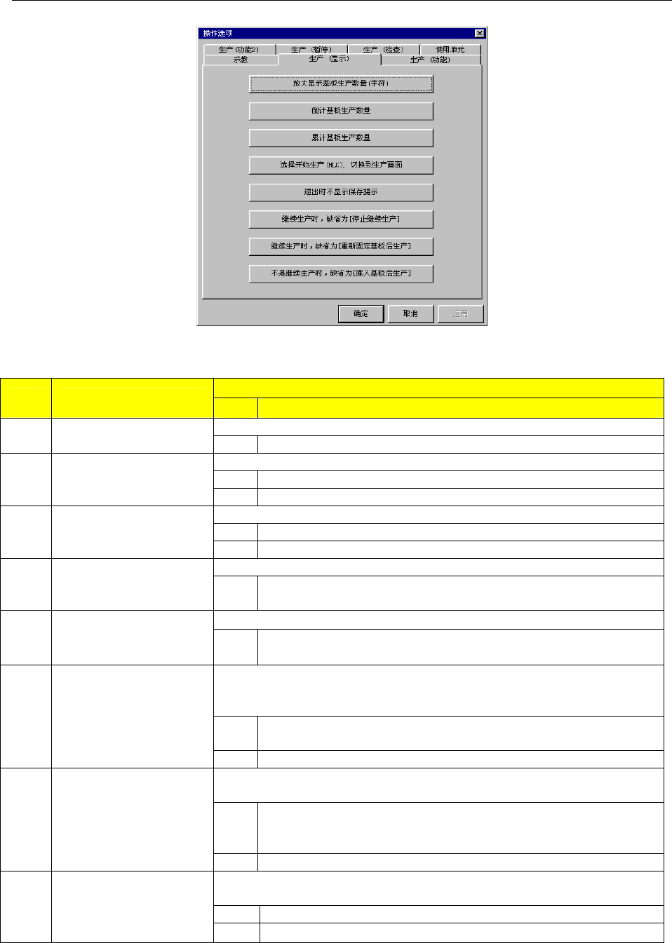 第 5 章 其它功能 Rev01 5-2-2-2 生产(显示) 设定生产时的画面显示等。 图5 - 6 生产时的显示选项 内容 序号. 项目 状态 运行及详细内容 设定是否用大写来显示生产运行中的 基板数量。 1 放大显示生产基板数量 凹 用大写来显示生产运行中已生产的基 板数量。 设定剩余生产基板数量的显示方法。 凹 显示剩余的预计生产数量。 2 倒计生产基板数量 凸 显示实际生产数量。 设定生产基板数量的更新方法。 凹 只要不清除生…