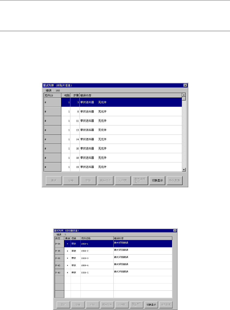重试列表最多可按发生顺序显示160件。但即使所有的元件已贴片,当存在吸取失败的送料器时,