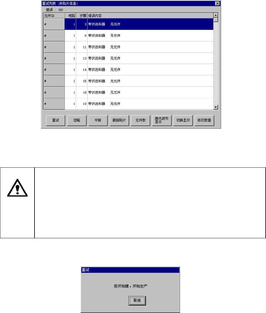 第2章 生产 Rev00 2-10-5-2 生产中的重试列表显示 生产中的重试列表显示根据生产中的错误发生状态,显示如图2-44。 图 2- 44重试列表(未贴片信息)的显示 为了判断是否继续生产而显示生产中的重试列表。因此,请务必要根据画面内的7个按钮来控 制其后的生产状态。 按下<START>开关,贴片头立即移动,开始生产。 为避免人身伤害, 在运行过程中切勿将手放入装置内部, 也不要将脸和头靠近装置。 在按下<S…