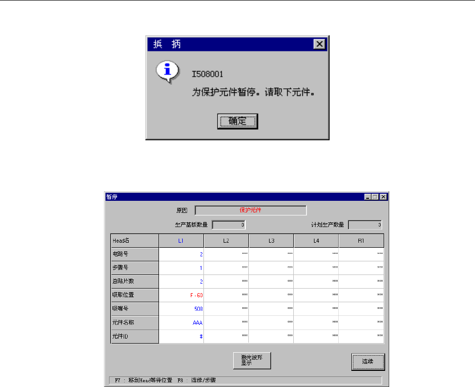 当暂停的原因为激光脏污错误、芯片直立错误、激光识别错误、异类元件错误时,显示激