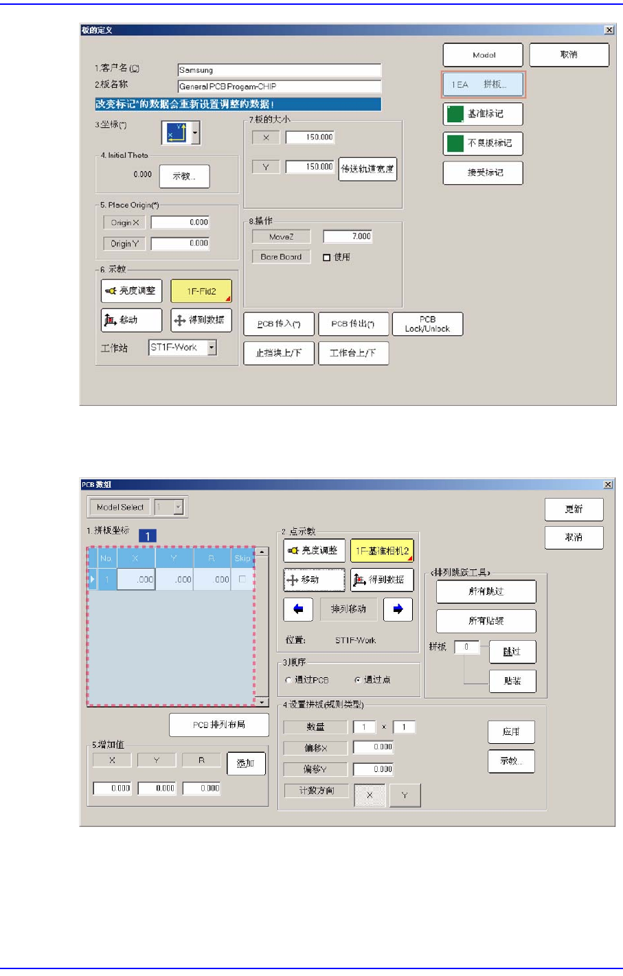 6-10 Samsung Componen t Placer SM431 Administrator’s Guide 在 ‘ 基板定义 ’ 对话框中自动选择所选的模型并 对应的组合框为非激活状态。 Block PCB 时 选择要设置的模型后, 请设置其他的 项目。 <1. 拼板 > 领域 设定多片 PCB 的每一单片对整片 PCB 的 ” 贴装原点 ” 的偏移量。 形成跟 <4. Set Array (Regu…