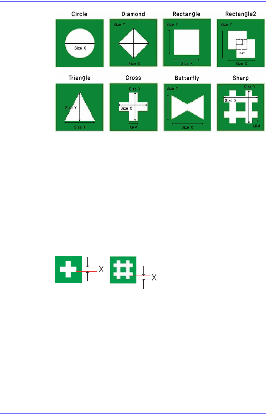6-22 Samsung Componen t Placer SM431 Administrator’s Guide <6. 形状数据 > 领域 它是有关基准标记形状的数据 。 < 尺寸 X> 编辑框 设定基准标记的 X 轴方向尺 寸。 (以设备的坐标系为准) < 尺寸 Y> 编辑框 设定基准标记的 Y 轴方向尺 寸。 (以设备的坐标系为准) <Arm> 编辑框 设定十字形…