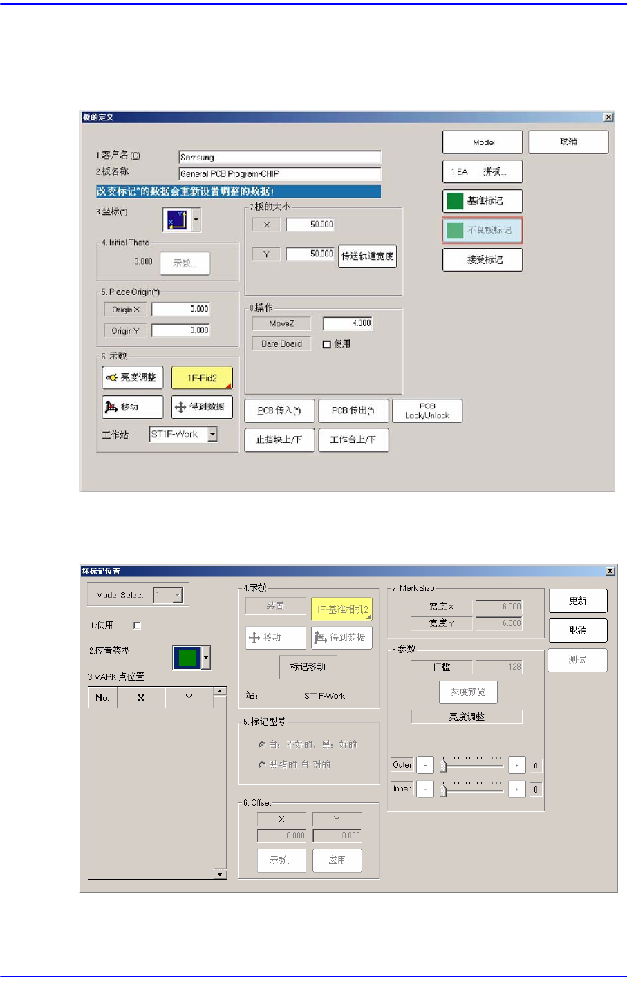 6-28 Samsung Componen t Placer SM431 Administrator’s Guide 6.4. Bad Mark 设定 用来区分安装的 PCB 的合格与否的标记为 “ 坏板标记 ” 。 对标记为不合格的 PCB 不 进行作业。 按下此按钮时, 显示以下编辑 “ 坏 板标记 ” 数据的对话框。 点击 < 不良板标记 > 按钮时, 显示如下 Bad Mark 数据编辑对话框 。 图 6.6 “ 坏…