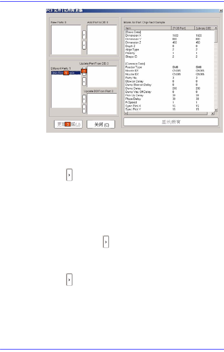7-5 元件的登记 单击 按钮在 <New Parts:> 列表框或 <Different Parts:> 列表框中增加要登录 到 Local Part DB 的 项目。 单击 < 更新数据 > 按 钮把对应部件登录到 Local Part DB 中。 < 改变组 > 按钮 把选定元件从当前元件库改到 其它元件库。 先在列表框选择需要改变 的元件 后单击该键。 < 删除元件库…