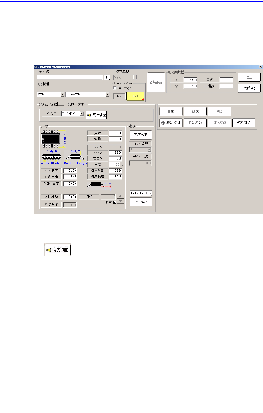 7-50 Samsung Componen t Placer SM431 Administrator’s Guide 7.1.3. IC 部品的数据设定 7.1.3.1. SOP 部品的数据设定 设定有关 SOP 部品排列数据。 图 7.17 “ 封装组 = SOP” 时的对话框 < 相机号 > 组合框 选择识别部品的摄象机。 详细事项请 参照 “7.1.1 共同识别 Data” 。 按钮 设定识别部品用摄象机的照明…